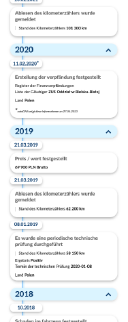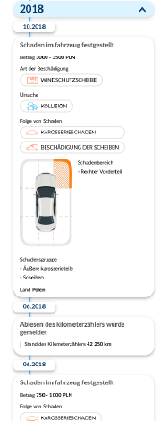 Der Bericht lässt komplette Überprüfung von ausgegebenen Fahrzeugtiteln (mit festgestellten Kilometerständen) und Einträgen in Eigentumtiteln durchführen. Die Ergänzung vom Bericht sind Informationen über Totalschaden des Fahrzeugs, Meldungen von Demontagestellen, Fahrzeughistorie und festgestellte Diebstähle. Interessant sind auch Daten über alte Verkaufsangebote des Fahrzeugs in den USA.